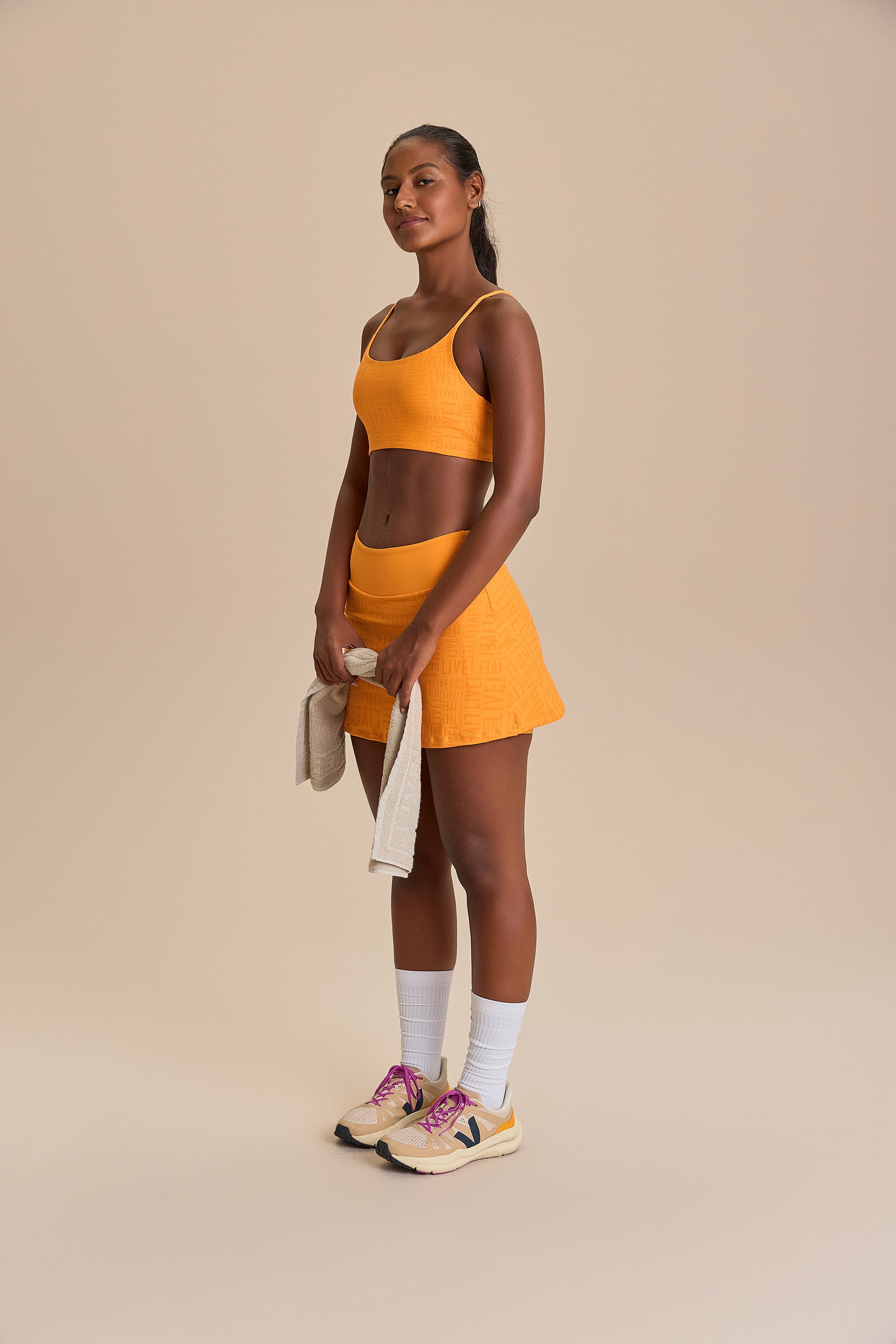 The LIVE! Curve Bra is designed for light to moderate workouts including gym, full body training, running, and walking. With a modern, minimalist design, it features thin straps and a straight hem for lightness and freedom of movement during low-impact activity. Removable pads, accessible through a small internal opening, add convenience. Made from medium-compression fabric with a soft touch, it provides a secure yet comfortable fit. Reflective LIVE! branding adds safety in low-light or nighttime activity, while UV 50+ protection makes it ideal for outdoor use during the day.